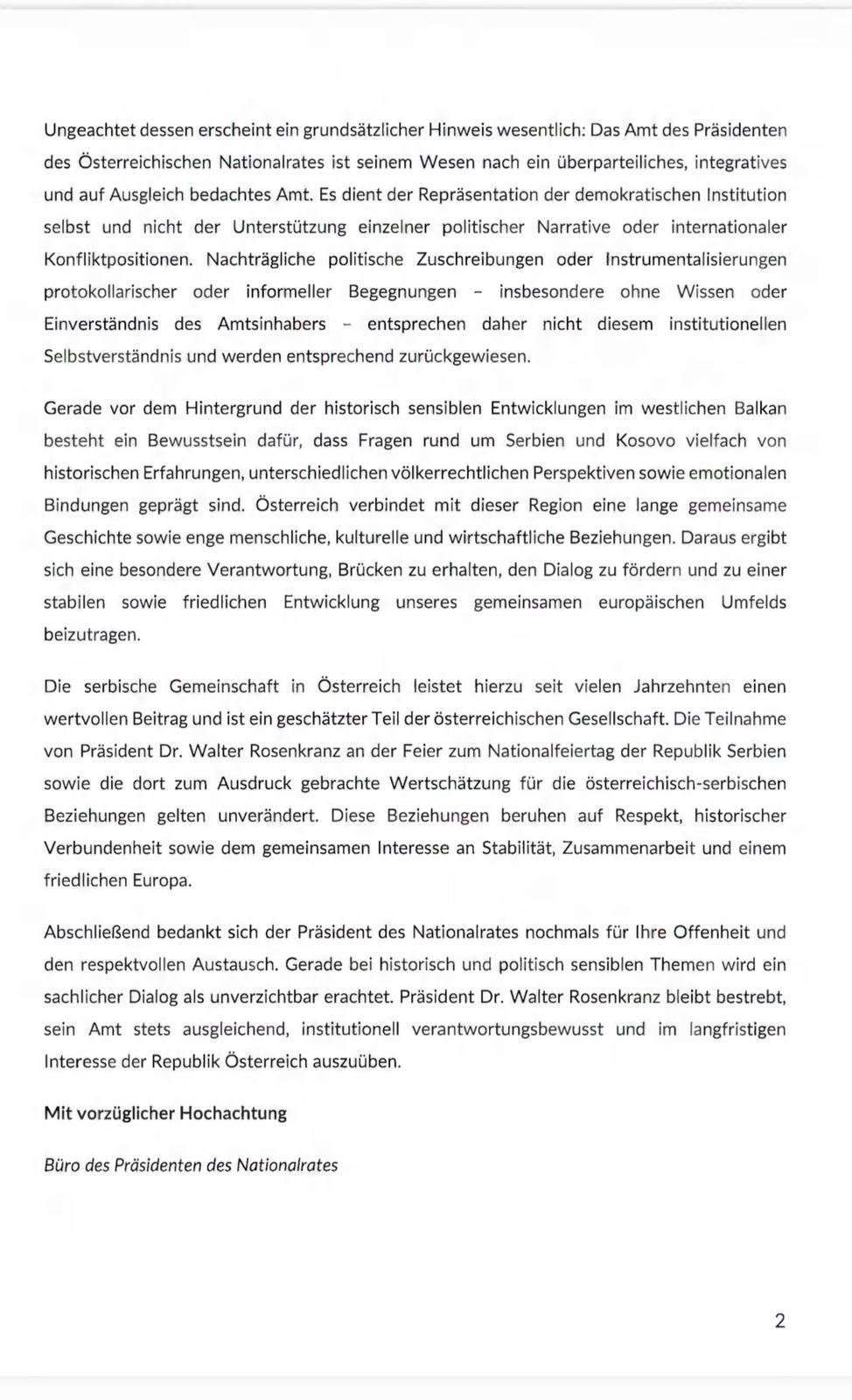 На крају, председник Скупштине се још једном захваљује на Вашој отворености и уважавајућој размени мишљења. Посебно код историјски и политички осетљивих тема, сматра се да је садржајан и објективан дијалог неизоставан. Председник др Валтер Розенкранц остаје посвећен томе да своју функцију обавља увек у духу помирења, институционалне одговорности и у дугорочном интересу Републике Аустрије.