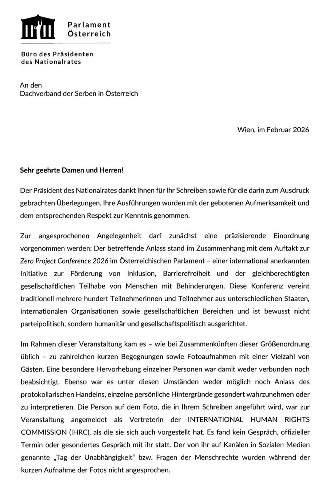 У вези са наведеним случајем, најпре је потребно извршити прецизније појашњење: предметни догађај одвијао се у оквиру отварања „Zero Project Conference 2026“ у Аустријском парламенту – међународно признате иницијативе за унапређење инклузије, приступачности и равноправног друштвеног учешћа особа са инвалидитетом. Ова конференција традиционално окупља неколико стотина учесница и учесника из различитих држава, међународних организација и друштвених области и свесно није страначко-политички усмерена, већ има хуманитарни и друштвено-политички карактер.
