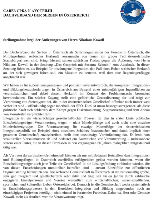 Савез Срба у Аустрији, као кровна организација српских удружења у Аустрији, изражава најоштрији протест поводом изјаве господина Николауса Ковала изнете у емисији „Das Gespräch mit Susanne Schnabl“, у којој је као пример неуспешне интеграције навео случај једног дечака српског порекла који је одбио да уђе у музеј због истакнуте заставе дугиних боја.