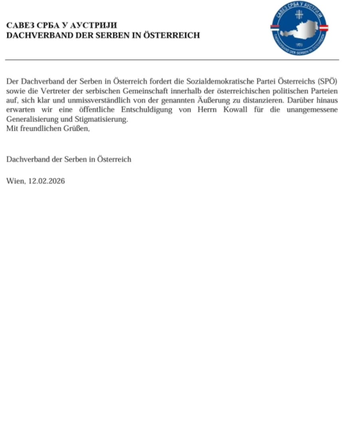 Савез Срба у Аустрији захтева да се Социјалдемократска партија Аустрије (SPÖ), као и представници српске заједнице унутар аустријских политичких странака, јасно и недвосмислено ограде од наведене изјаве. Такође очекујемо јавно извињење господина Коwалла због непримерене генерализације и стигматизације.